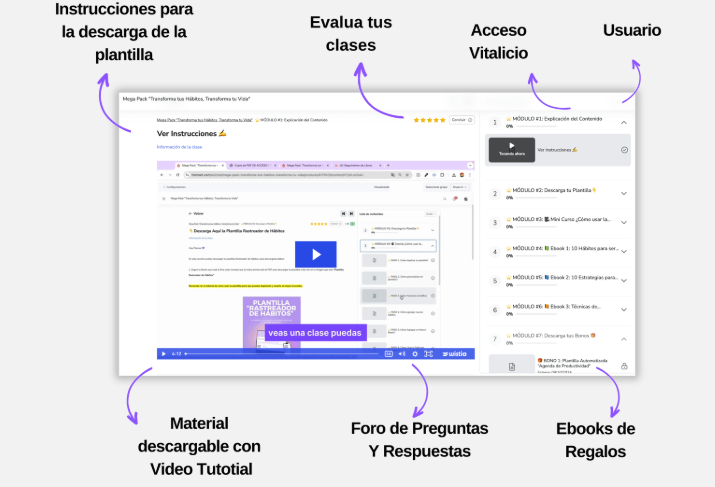 Con nuestro mega pack, aprenderás el paso a paso para convertirte en una experta en el desarrollo de hábitos efectivos y en la creación de una vida equilibrada. Domina técnicas comprobadas que te permitirán transformar tu rutina, gestionar tu tiempo y alcanzar tus metas , destacándote por tu enfoque y disciplina.